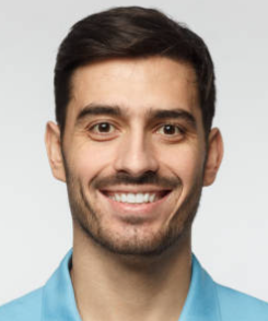 Smiling man beside a clean and sparkling backyard pool on a sunny day.